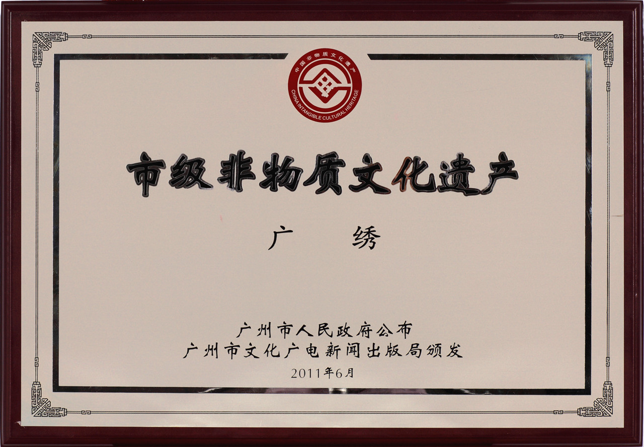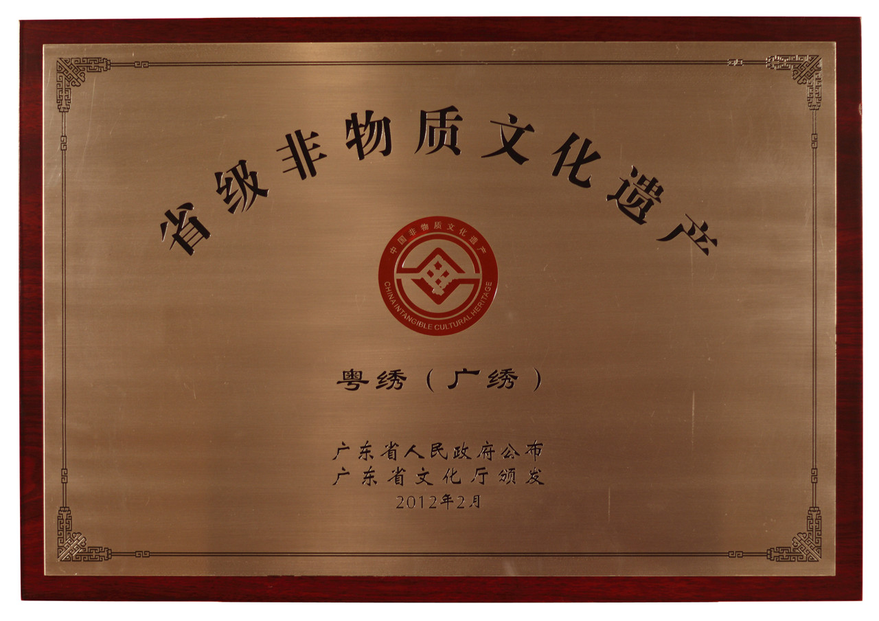 省级非物质文化遗产—粤绣(广绣) 广东省人民政府公布、广东省文化厅颁发 2012-02-01 永久