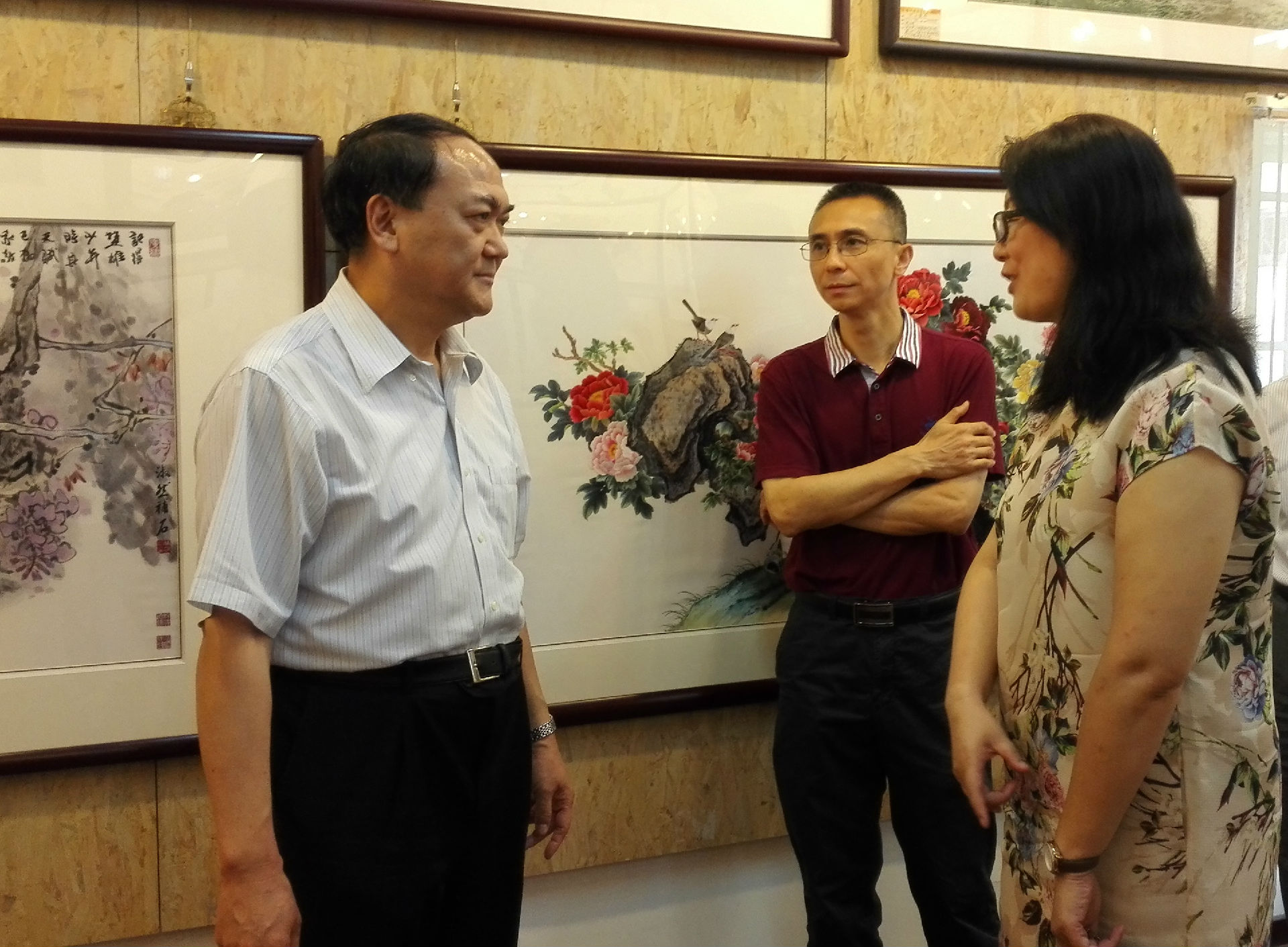 周郑生会长(左一)、白涛董事长(右一)与我司余锦初董事长(中)对广绣的发展相互交换了意见