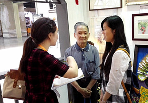 在展会现场,中国刺绣艺术大师许炽光及广绣艺人梁淑萍接受本地媒体访问